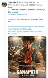 मीडिया की माने तो, ‘गणपत’ का ये नया पोस्टर टाइगर श्रॉफ ने अपने ट्विटर अकाउंट पर शेयर किया है। इसे शेयर करते हुए टाइगर ने लिखा – ‘उसको कोई क्या रोकेगा…जब बप्पा का है उसपे हाथ..आ रहा है गणपत…करने एक नई दुनिया की शुरूआत..फिल्म इस दशहरा, 20 अक्टूबर को सिनेमाघरों में रिलीज होगी।