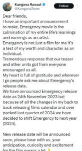 सूत्रों से प्राप्त जानकारी के अनुसार, कंगना ने इस बारे में अपने एक्स अकाउंट पर जानकारी शेयर की है। एक्ट्रेस ने लिखा, “प्रिय दोस्तों, मुझे एक जरूरी अनाउंसमेंट करनी है, इमरजेंसी फिल्म एक आर्टिस्ट के रूप में मेरे पूरे जीवन लर्निंग और अर्निंग का कल्मिनाशन है। इमरजेंसी मेरे लिए सिर्फ एक फिल्म नहीं है, यह एक इंसान के रूप में मेरे मूल्य और चरित्र की परीक्षा है। हमारे टीज़र और अन्य इकाइयों से मिली जबरदस्त प्रतिक्रिया ने हम सभी को काफी उत्साहित किया है। कंगना ने आगे लिखा, “मेरा दिल ग्रेटिट्यूड से भरा हुआ है और मैं जहां भी जाती हूं लोग मुझसे इमरजेंसी की रिलीज डेट के बारे में पूछते हैं। हमने इमरजेंसी रिलीज की तारीख 24 नवंबर 2023 अनाउंस की थी, लेकिन मेरी बैक टू बैक रिलीजिंग फिल्मों के कैलेंडर में सभी चेंजेस और 2024 के लास्ट क्वार्टर के ओवर पैक होने के कारण हमने इमरजेंसी को अगले साल (2024) में शिफ्ट करने का फैसला किया है।