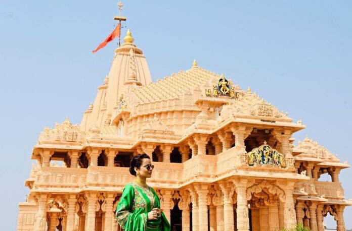 अभिनेत्री कंगना रनौत हाल ही में अपनी फिल्म ‘तेजस’ को लेकर चर्चा में बनी हुई है। वहीं आज अभिनेत्री बाबा सोमनाथ जी के दर्शन करने पहुंची है। कंगना ने सोमनाथ मंदिर के दर्शन कर पूजा-अर्चना की। मीडिया की माने तो, वह स्थानीय कर्मचारियों के सहयोग से सोमनाथ के राम मंदिर में भी गई, जहां उन्होंने राम नाम की पुस्तक में राम जी का नाम लिखा, उसके बाद श्री कृष्ण मोक्ष भूमि के दर्शन किए। सोमनाथ जी के बहुत निकट वो स्थान है जहां श्री कृष्ण जी के पैरों में बाण लगा था। वहीं उन्होंने मोक्ष की प्राप्ति की थी।