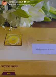 मीडिया की माने तो, कंगना रनौत ने इनविटेशन कार्ड शेयर किया है। उन्होंने इसे लेकर अपनी इंस्टा स्टोरी पर एक वीडियो भी शेयर किया है। कंगना ने बताया है कि फाइनली उन्हें राम मंदिर की प्राण-प्रतिष्ठा के लिए न्यौता मिल गया है।