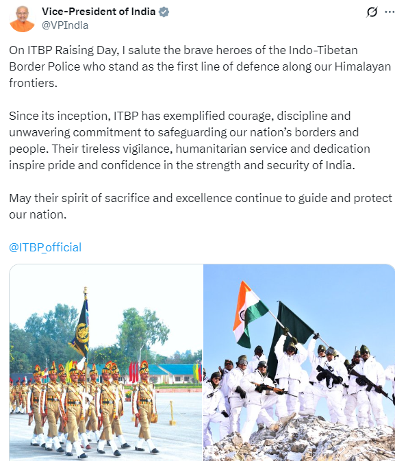 उपराष्ट्रपति ने आगे कहा कि आईटीबीपी ने अपनी स्थापना के बाद से ही भारत की सीमाओं और लोगों की सुरक्षा के लिए साहस, अनुशासन और अटूट प्रतिबद्धता का उदाहरण प्रस्तुत किया है। उन्होंने कहा कि बल की अथक सतर्कता, मानवीय सेवा और समर्पण देश की शक्ति और सुरक्षा में गर्व और विश्वास को प्रेरित करते हैं। उपराष्ट्रपति ने कामना की कि आईटीबीपी बल की त्याग और उत्कृष्टता की भावना भारत का मार्गदर्शन और सुरक्षा करती रहे।