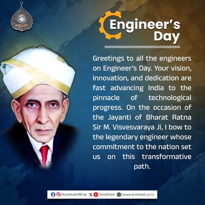 इस बीच, गृह मंत्री अमित शाह ने एम. विश्वेश्वरैया को एक महान इंजीनियर बताया। सोशल मीडिया पोस्ट में उन्होंने सभी इंजीनियरों की सराहना की। उन्होंने कहा कि इंजीनियरों की दूरदर्शिता, नवाचार और समर्पण देश को तकनीकी प्रगति के शिखर पर तेज़ी से आगे बढ़ा रहे हैं।