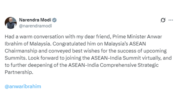 मीडिया सूत्रों से मिली जानकारी के अनुसार, प्रधानमंत्री नरेन्द्र मोदी ने कहा है कि वह आसियान शिखर सम्मेलन में वर्चुअली शामिल होंगे। सोशल मीडिया पोस्ट में, प्रधानमंत्री मोदी ने कहा कि उन्होंने मलेशिया के प्रधानमंत्री अनवर इब्राहिम से बातचीत की और मलेशिया द्वारा आसियान की अध्यक्षता ग्रहण करने पर उन्हें बधाई दी। प्रधानमंत्री ने आगामी शिखर सम्मेलनों की सफलता के लिए अपनी शुभकामनाएं भी दीं और आसियान-भारत व्यापक रणनीतिक साझेदारी को और प्रगाढ़ बनाने की अपनी प्रतिबद्धता दोहराई। 47वाँ आसियान शिखर सम्मेलन अन्य शिखर सम्मेलनों के साथ इस महीने की 26 से 28 तारीख तक मलेशिया की राजधानी कुआलालंपुर में आयोजित किया जाएगा।