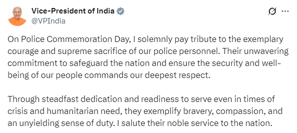 मीडिया सूत्रों से मिली जानकारी के अनुसार, उपराष्ट्रपति सी. पी. राधाकृष्णन ने आज पुलिस स्मृति दिवस पर पुलिसकर्मियों के अनुकरणीय साहस और सर्वोच्च बलिदान को श्रद्धांजलि अर्पित की। सोशल मीडिया पोस्ट में उन्होंने कहा कि राष्ट्र की रक्षा और लोगों की सुरक्षा तथा कल्याण सुनिश्चित करने के लिए पुलिस की अटूट प्रतिबद्धता सम्मान का स्रोत है। उपराष्ट्रपति ने कहा कि संकट और मानवीय आवश्यकता के समय भी सेवा के लिए दृढ़ समर्पण और तत्परता के माध्यम से, पुलिस बहादुरी, करुणा और कर्तव्य के प्रति अटूट भावना का उदाहरण प्रस्तुत करती है।