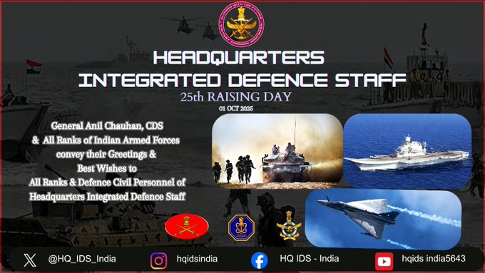 मीडिया सूत्रों से मिली जानकारी के अनुसार, एकीकृत रक्षा स्टाफ मुख्यालय ने आज अपना 25वां स्थापना दिवस मनाया। रक्षा मंत्रालय ने कहा कि एकीकृत रक्षा स्टाफ मुख्यालय ने नए संयुक्त सैन्य ढाँचों के निर्माण में सहयोग दिया है। साथ ही एकीकृत सैन्य-स्तरीय तंत्र स्थापित करने के उद्देश्य से की गई पहलों में भी योगदान दिया है। मंत्रालय ने आगे कहा कि इस सेवा ने साइबर, कृत्रिम बुद्धिमत्ता और अंतरिक्ष जैसे उभरते क्षेत्रों में देश की तैयारियों को आगे बढ़ाया है।