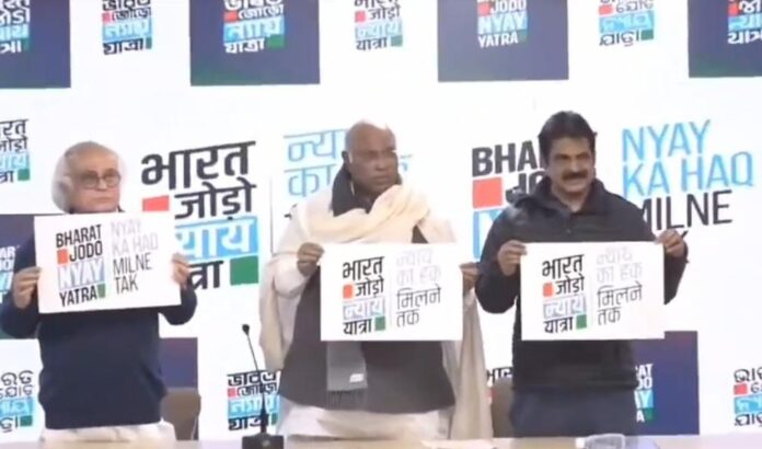 मीडिया सूत्रों से मिली जानकारी के अनुसार, आज दिल्ली स्थित AICC मुख्यालय में कांग्रेस अध्यक्ष मल्लिकार्जुन खड़गे ने ‘भारत जोड़ो न्याय यात्रा’ का लोगो लॉन्च किया। इस दौरान उन्होंने प्रेस कॉन्फ्रेंस कर बताया कि भारत जोड़ो न्याय यात्रा देश के बुनियादी सामाजिक, राजनीतिक, आर्थिक मुद्दों पर केंद्रित होगी। शनिवार को संवाददातओं से मल्लिकार्जुन खड़गे ने कहा कि भारत जोड़ो न्याय यात्रा, देशवासियों को आर्थिक, सामाजिक और राजनीतिक न्याय दिलाने की ओर हमारा एक मजबूत कदम है।