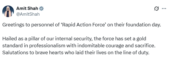 मीडिया सूत्रों से मिली जानकारी के अनुसार, केंद्रीय गृह मंत्री अमित शाह ने रैपिड एक्शन फोर्स के स्थापना दिवस पर कार्मिको को बधाई दी है। एक सोशल मीडिया पोस्ट में श्री शाह ने रैपिड एक्शन फोर्स को देश की आंतरिक सुरक्षा का एक स्तंभ बताया है। उन्होंने कहा कि इस बल ने अदम्य साहस और बलिदान के साथ स्वर्णिम मानक स्थापित किए हैं। श्री शाह ने कर्तव्य पथ पर अपने प्राणों की आहुति देने वाले वीर जवानों को नमन किया।