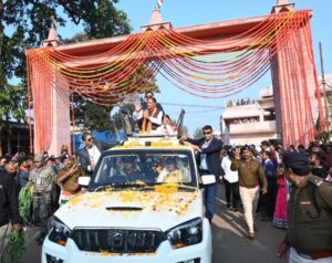 छत्तीसगढ़ के मुख्यमंत्री विष्णु देव साय सीएम बनने के बाद पहली बार जशपुर पहुंचे। इस दौरान लोगों ने उनका भव्य स्वागत किया। नगरवासियों ने पुष्प वर्षा से सीएम का स्वागत किया। मीडिया सूत्रों से मिली जानकारी के अनुसार, सीएम विष्णु देव साय ने खुली जीप में सवार होकर नागरिकों का अभिवादन स्वीकार किया। जिसके बाद सीएम साय कई कार्यक्रमों में शामिल हुए। वहीं, सीएम साय आज “जशपुरिया माटी अटल सुशासन समारोह” में शामिल हुए। सीएम साय ने जशपुर के रंजीता स्टेडियम में आयोजित इस समारोह में विभिन्न शासकीय विभागों की प्रदर्शनी का अवलोकन किया।