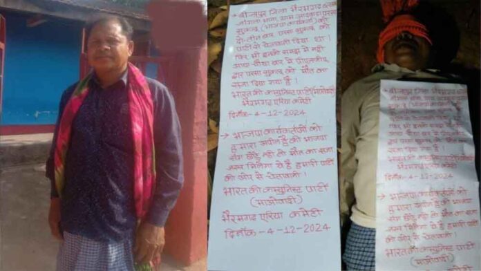 बीजापुर: मीडिया सूत्रों से मिली जानकारी के अनुसार, मंगलवार को आदवाड़ा से वापस लौटते समय नक्सलियों ने बिरियाभूमि के पूर्व सरपंच को अगवा कर लिया था। बीती रात नक्सलियों ने उनकी हत्या कर शव के पास एक पर्चा छोड़ा है। जिसमें पूर्व सरपंच को भाजपा कार्यकर्ता बताते हुए उन्हें चेतावनी देने की बात लिखी हुई है। जिले के भैरमगढ़ ब्लाक के ग्राम बिरियाभूमि के पूर्व सरपंच सुकलु फरसा की बीती रात नक्सलियों ने हत्या कर दी।