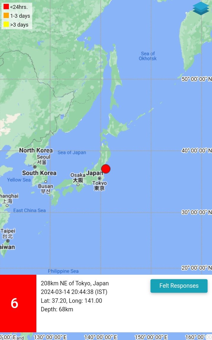 मीडिया सूत्रों से मिली जानकारी के अनुसार, जापान कल भूकंप के झटके महसूस किए गए। जापान के टोक्यो में आए भूकंप की तीव्रता 6.0 रही। राष्ट्रीय भूकंपीय निगरानी केंद्र (एनएसएमसी) के अनुसार भूकंप देर रात 08 बजकर 44 मिनट पर महसूस किए गए। जापान में आए भूकंप के झटको से अभी तक जान-माल के नुकसान की कोई खबर नहीं है। भूकंप की गहराई 68 किलोमीटर थी। जानकारी के मुताबिक, भूकंप का एपिसेंटर 37.20 लैटिट्यूड और 141.00 लोंगिट्यूड था। भूकंप का केंद्र टोक्यो, जापान से 208 किलोमीटर उत्तर पूर्व पर था