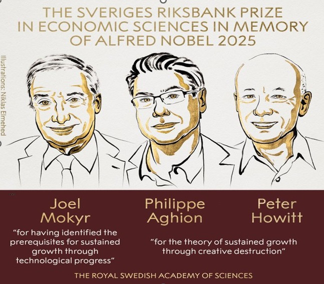 मीडिया सूत्रों से मिली जानकारी के अनुसार, इस वर्ष का अर्थशास्त्र का नोबेल पुरस्कार जोएल मोकिर, फिलिप अघियन और पीटर हॉविट को नवाचार और आर्थिक विकास पर उनके अभूतपूर्व कार्य के लिए देने की घोषणा की गई है।