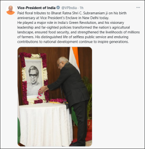 मीडिया सूत्रों से मिली जानकारी के अनुसार, उपराष्ट्रपति सी.पी. राधाकृष्णन ने नई दिल्ली में भारत रत्न से सम्मानित सी. सुब्रमण्यम की जयंती पर उपराष्ट्रपति एन्क्लेव में उन्हें पुष्पांजलि अर्पित की। सोशल मीडिया पोस्ट में उन्होंने कहा कि सुब्रमण्यम ने देश की हरित क्रांति में महत्वपूर्ण भूमिका निभाई।