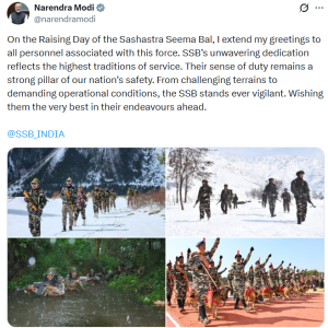 आप को बता दे, प्रधानमंत्री ने SSB कर्मियों द्वारा कठिन भूभागों और चुनौतीपूर्ण परिस्थितियों में देश की रक्षा करने वाली भूमिका की सराहना की। उन्होंने कहा कि यह बल राष्ट्र सेवा में सदैव सजग खड़ा रहता है। SSB नेपाल और भूटान सीमाओं की सुरक्षा का दायित्व निभाता है।