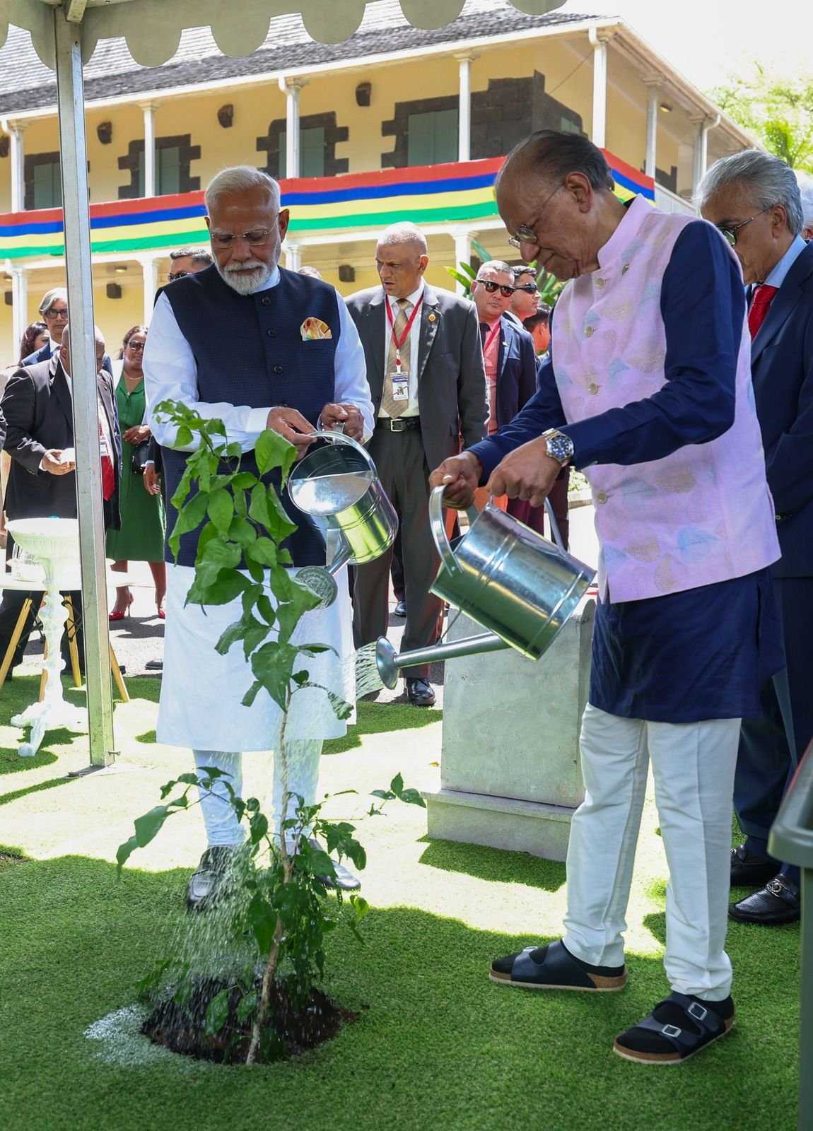पुष्पांजलि समारोह के बाद श्री मोदी और मॉरिशस के प्रधानमंत्री डॉ. नवीनचंद्र रामगुलाम ने एक उद्यान में एक पेड़ माँ के नाम पहल के तहत एक पेड़ लगाया।