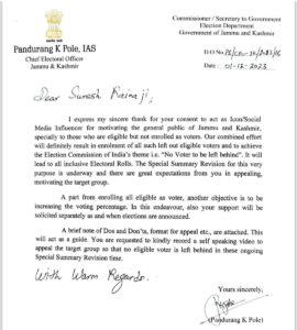 मीडिया की माने तो, इस बारे में निर्वाचन अधिकारी ने कहा कि सुरेश रैना एक क्रिकेट दिग्गज हैं और भारत में एक सम्मानित व्यक्ति होने के नाते खासकर युवाओं के बीच काफी प्रभाव रखते हैं। इस प्रभाव का उपयोग अधिक व्यक्तियों को चुनावी प्रक्रिया में भाग लेने के लिए प्रोत्साहित करने के लिए किया जा सकता है, जिससे उच्च मतदान प्रतिशत और अधिक नागरिक जुड़ाव हो सकेगा।