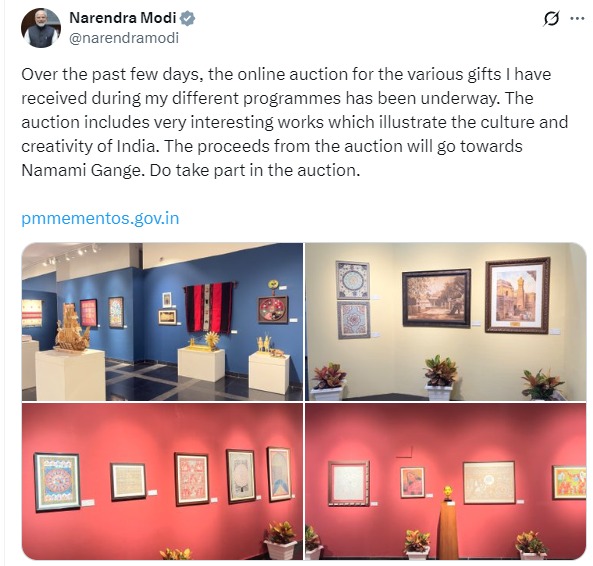 मीडिया सूत्रों से मिली जानकारी के अनुसार, प्रधानमंत्री नरेन्‍द्र मोदी ने नागरिकों से प्रधानमंत्री स्मृति चिन्ह ई-नीलामी के 7वें संस्करण में सक्रिय रूप से भाग लेने का आग्रह किया है। यह नीलामी pmmementos.gov.in पर 2 अक्टूबर तक जारी है। सोशल मीडिया पोस्ट में प्रधानमंत्री मोदी ने कहा कि इस नीलामी में भारत की संस्कृति और रचनात्मकता को दर्शाने वाली कृतियाँ शामिल हैं। इस वर्ष की ई-नीलामी में पूरे देश से 1,300 से अधिक अनूठी वस्तुएँ प्रदर्शित की जा रही हैं। नीलामी से प्राप्त सभी आय नमामि गंगे परियोजना में योगदान करेगी।