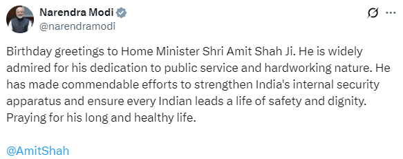 मीडिया सूत्रों से मिली जानकारी के अनुसार, प्रधानमंत्री नरेन्द्र मोदी ने गृहमंत्री अमित शाह को जन्मदिन की हार्दिक शुभकामनाएं दी हैं। प्रधानमंत्री मोदी ने एक सोशल मीडिया पोस्ट में कहा कि अमित शाह लोक सेवा के प्रति समर्पण और कठिन परिश्रम के लिए जाने जाते हैं। प्रधानमंत्री ने कहा कि अमित शाह ने भारत के आंतरिक सुरक्षा तंत्र को मजबूत करने के लिए सराहनीय प्रयास किये हैं तथा प्रत्येक भारतीय के लिए सुरक्षा और गरिमा सुनिश्चित की है। प्रधानमंत्री मोदी ने उनके दीर्घ और स्वस्थ जीवन की कामना की।