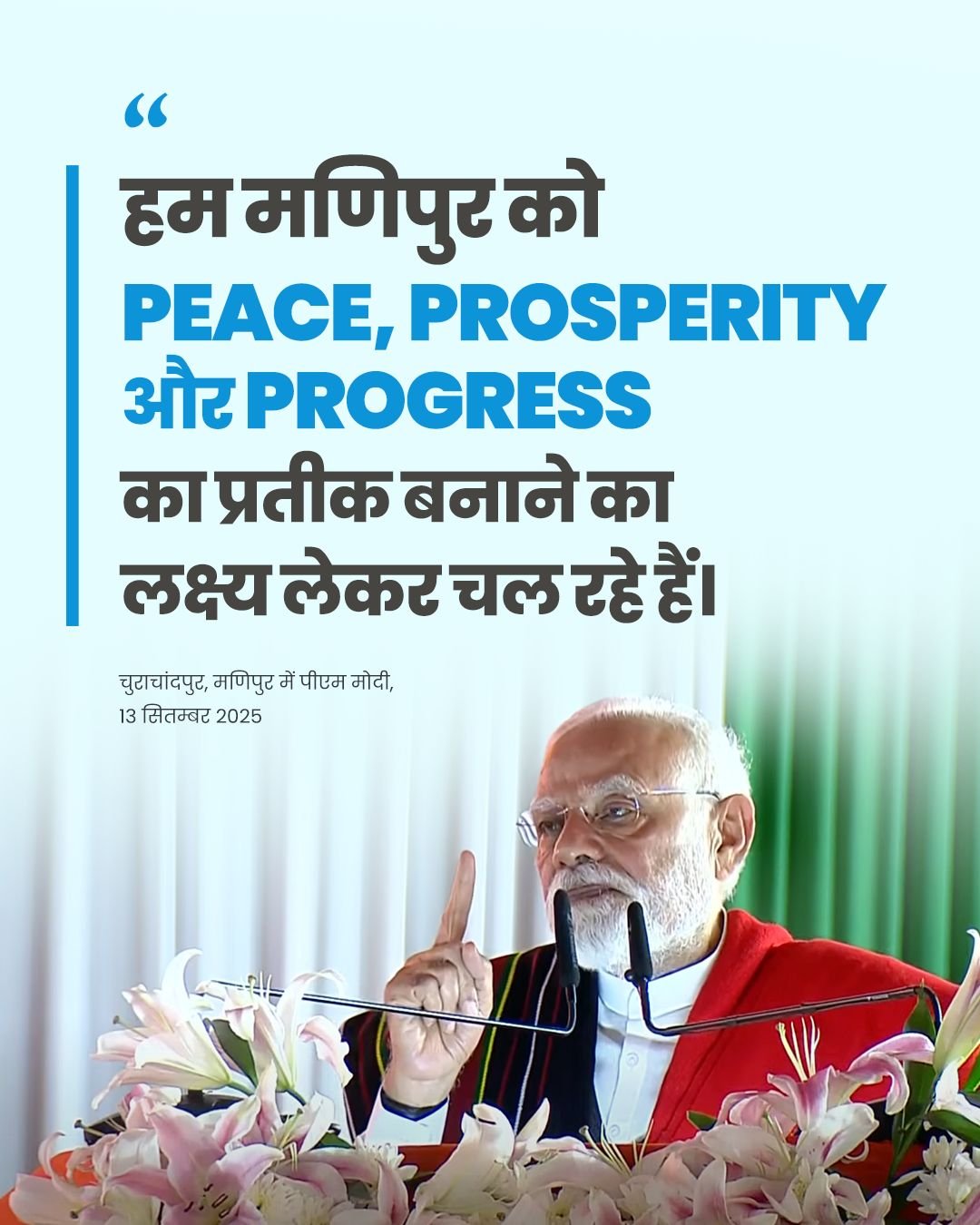 प्रधानमंत्री ने बताया कि केंद्र सरकार ने पूर्वोत्तर में कनेक्टिविटी सुधार पर ज़ोर दिया है और हाल के वर्षों में मणिपुर में राष्ट्रीय राजमार्गों पर ₹3,700 करोड़ खर्च किए गए हैं। उन्होंने मणिपुर को देश की प्रगति का अहम स्तंभ बताते हुए लोगों के साहस और दृढ़ता की सराहना की।