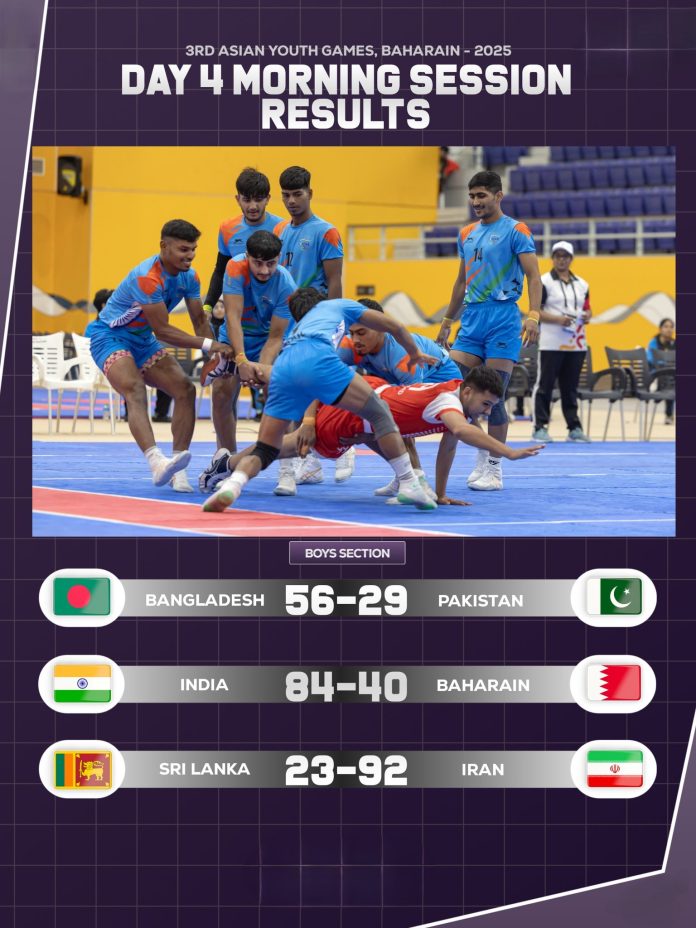 मीडिया सूत्रों से मिली जानकारी के अनुसार, बहरीन में एशियाई युवा खेलों में पुरुषों की कबड्डी स्पर्धा में भारत ने आज बहरीन को 84-40 से हराया। इसी स्पर्धा में कल भारत का सामना थाइलैंड से होगा। वहीं, महिला वर्ग में कल पदक के लिए भारत का सामना ईरान से होगा।