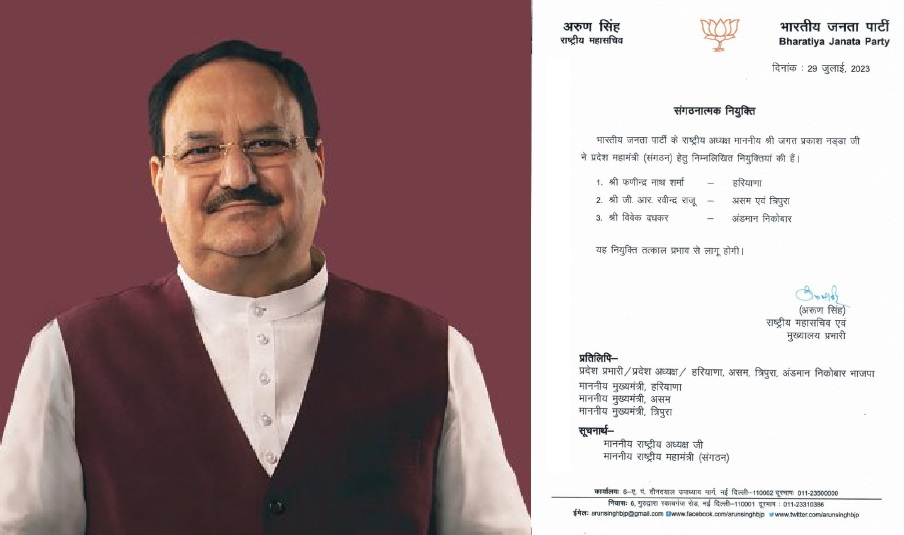 भाजपा राष्ट्रीय अध्यक्ष जेपी नड्डा ने प्रदेश महामंत्री (संगठन) हेतु नियुक्तियां की