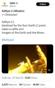 भारत के सौर मिशन Aditya L1 ने ली सेल्फी, इसरो ने सोशल मीडिया पर साझा की तस्वीर