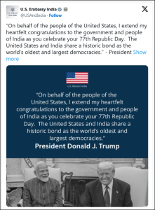 आप को बता दे, अमेरिकी दूतावास ने दिल्ली के कर्तव्य पथ पर परेड समाप्त होने के बाद दोपहर 2:14 बजे ट्रंप का संदेश साझा किया। भारत ने यूरोपीय परिषद अध्यक्ष एंटोनियो कोस्टा व यूरोपीय आयोग अध्यक्ष उर्सुला वॉन डेर लेयेन को मुख्य अतिथि बनाया। हाल के वर्षों में भारत अमेरिकी सैन्य हार्डवेयर जैसे सी-130जे व अपाचे हेलीकॉप्टर का अधिक उपयोग कर रहा है जो आज फ्लाईपास्ट में शामिल हुए। हालांकि व्यापार में ट्रंप द्वारा भारतीय वस्तुओं पर 50 प्रतिशत टैरिफ लगाने से संबंधों में गिरावट आई तथा द्विपक्षीय व्यापार समझौता अभी अंतिम रूप नहीं ले सका।