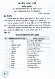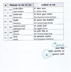 मध्यप्रदेश विधानसभा चुनाव के लिए भारतीय जनता पार्टी ने अपनी चौथी सूची जारी कर दी है। चुनाव की तारीखों के ऐलान के ठीक बाद BJP ने चौथी सूची में 57 उम्मीदवारो के नाम का ऐलान किया है। मीडिया की माने तो, सीएम शिवराज सिंह चौहान बुधनी से चुनाव लड़ेंगे, प्रदेश के गृह मंत्री नरोत्तम मिश्रा दतिया से, गोपाल भार्गव रेहली से, विश्वास सारंग नरेला से और तुलसीराम सिलावट सांवेर से चुनाव लड़ेंगे।