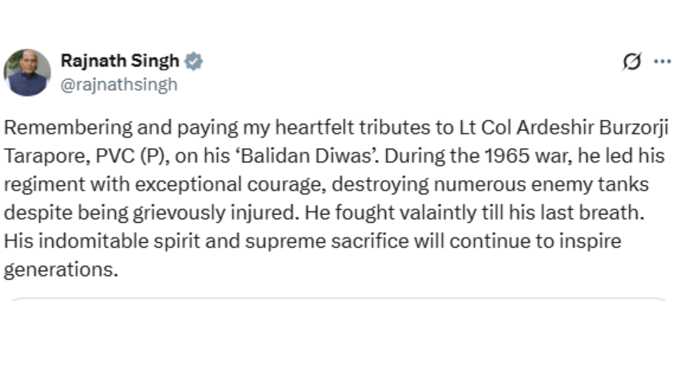 मीडिया सूत्रों से मिली जानकारी के अनुसार, रक्षामंत्री राजनाथ सिंह ने परमवीर चक्र विजेता लेफ्टिनेंट कर्नल आर्देशिर बुर्जोरजी तारापोरे को उनके बलिदान दिवस पर श्रद्धांजलि अर्पित की है। श्री सिंह ने सोशल मीडिया पोस्ट में कहा कि 1965 के युद्ध के दौरान श्री तारापोरे ने असाधारण शौर्य और साहस के साथ अपने रेजिमेंट का नेतृत्व किया और गंभीर रूप से घायल होने के बावजूद शत्रु के अनेक टैंकों को ध्वस्त किया और अंतिम सांस तक बहादुरी से लड़े। उनकी अदम्य ऊर्जा और सर्वोच्च बलिदान अनेक पीढि़यों को प्रेरित करता रहेगा।