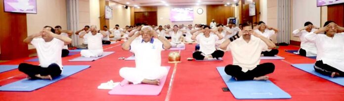 मीडिया सूत्रों से मिली जानकारी के अनुसार, आज राज्यपाल मंगुभाई पटेल ने 11वें अंतर्राष्ट्रीय योग दिवस के अवसर पर राजभवन में सामूहिक योगाभ्यास का नेतृत्व किया। राज्यपाल पटेल के साथ करीब 150 प्रतिभागी सामूहिक योगाभ्यास कार्यक्रम में शामिल हुए। अंतर्राष्ट्रीय योग दिवस कार्यक्रम राजभवन के सांदीपनि सभागार मे हुआ। प्रधानमंत्री नरेन्द्र मोदी जी के नेतृत्व में “एक पृथ्वी-एक स्वास्थ्य” थीम पर आयोजित अंतर्राष्ट्रीय योग दिवस के विशाखापटनम कार्यक्रम का लाईव प्रसारण भी किया गया।योगाभ्यास कार्यक्रम में राज्यपाल के अपर मुख्य सचिव के.सी. गुप्ता भी मौजूद थे।