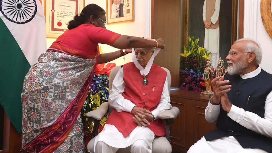 भारतीय जनता पार्टी के वरिष्ठ नेता लाल कृष्ण आडवाणी को रविवार को भारत रत्न से सम्मानित किया गया। सूत्रों से मिली जानकारी के अनुसार, राष्ट्रपति द्रौपदी मुर्मू के हाथों आडवाणी को ये सम्मान मिला। बता दें कि इस दौरान पीएम नरेंद्र मोदी लालकृष्ण आडवाणी के बगल में बैठे दिखाई दिए। इससे पहले लालकृष्ण आडवाणी के घर गृहमंत्री अमित शाह पहुचे थे। अमित शाह के अलावा रक्षामंत्री राजनाथ सिंह, भारतीय जनता पार्टी के राष्ट्रीय अध्यक्ष जेपी नड्डा भी आडवाणी के घर पहुंचे थे। बता दें कि इस साल एमएस स्वामीनाथन, लाल कृष्ण आडवाणी,  कर्पूरी ठाकुर, नरसिम्हा राव और चौधरी चरण सिंह को भारत रत्न से सम्मानित किया जाएगा।