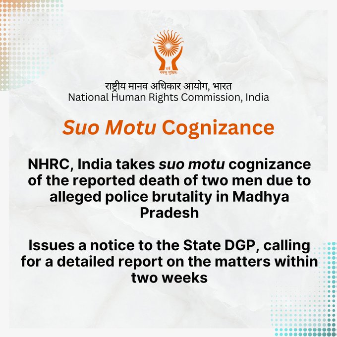 मीडिया सूत्रों से मिली जानकारी के अनुसार, राष्ट्रीय मानवाधिकार आयोग ने मध्य प्रदेश के पुलिस महानिदेशक को कथित पुलिस बर्बरता के कारण दो व्यक्तियों की कथित मौत से संबंधित मामले में नोटिस जारी किया है। एनएचआरसी ने कहा कि पहली घटना, जो इस महीने की 10 तारीख की रात को हुई थी। इस घटना में भोपाल में एक पार्टी से लौटते समय दो कांस्टेबलों द्वारा मारपीट किए जाने के बाद एक 22 वर्षीय छात्र की मौत हो गई थी।