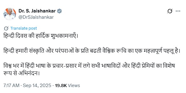 मीडिया सूत्रों से मिली जानकारी के अनुसार, विदेश मंत्री डॉक्टर एस. जयशंकर ने आज हिंदी दिवस के अवसर शुभकामनाएं दी हैं। उन्होंने सोशल मीडिया पोस्ट में कहा है कि हिन्दी देश की संस्कृति और परम्पराओं में वैश्विक रूचि बढ़ाने का महत्वपूर्ण पहलू है। उन्होंने विश्व में हिन्दी भाषा के प्रचार-प्रसार में लगे भाषाविदों और हिंदी उत्साहियों को बधाई दी।