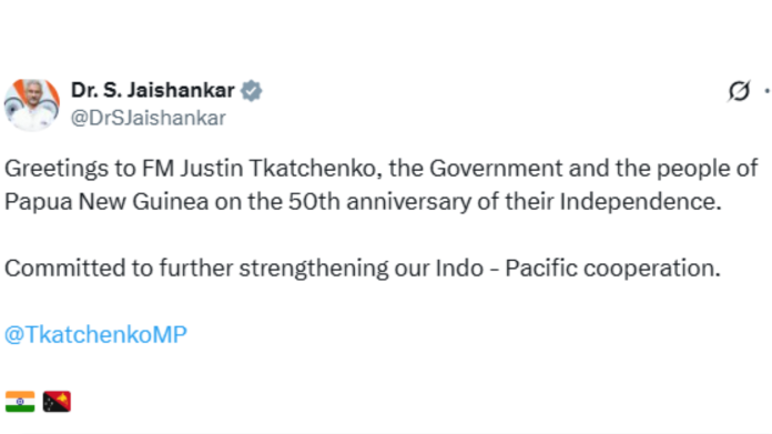 विदेश मंत्री डॉ. एस. जयशंकर ने पापुआ न्यू गिनी को स्वतंत्रता दिवस की 50वीं वर्षगांठ पर दी शुभकामनाएँ
