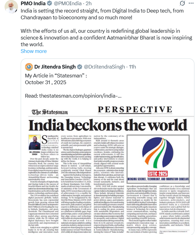 मीडिया सूत्रों से मिली जानकारी के अनुसार, प्रधानमंत्री नरेन्‍द्र मोदी ने कहा है कि सभी लोगों के प्रयासों से देश विज्ञान और नवाचार क्षेत्र में वैश्‍विक नेतृत्‍व को नए सिरे से परिभाषित कर रहा है। आत्‍मविश्‍वास से भरा आत्‍मनिर्भर भारत अब पूरे विश्‍व को प्रेरित कर रहा है। इस क्षेत्र में पिछले कुछ वर्षों में हुई प्रगति के बारे में एक अंग्रेजी दैनिक में विज्ञान और प्रौद्योगिकी मंत्री डॉ. जितेंद्र सिंह के लेख को साझा करते हुए श्री मोदी ने सोशल मीडिया पोस्‍ट में कहा कि भारत डिजिटल इंडिया से डीप-टेक और चंद्रयान से जैव अर्थव्‍यवस्‍था तक नये आयाम स्‍थापित कर रहा है।