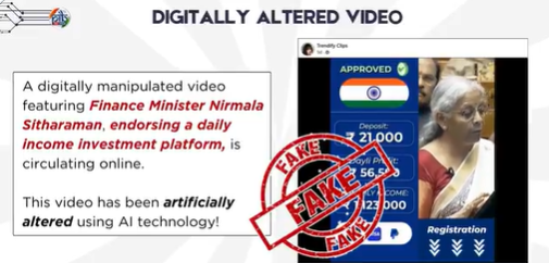 मीडिया सूत्रों से मिली जानकारी के अनुसार, सरकार ने सोशल मीडिया पर प्रसारित एक वीडियो का खंडन किया है जिसमें झूठा दावा किया गया है कि वित्त मंत्री निर्मला सीतारामन एक ऐसे निवेश कार्यक्रम का प्रचार कर रही हैं जो आसान दैनिक आय का वादा करता है। पत्र सूचना कार्यालय की फैक्ट चेक यूनिट ने बताया है कि यह दावा पूरी तरह से फर्जी है और वीडियो को डिजिटल रूप से संशोधित किया गया है। इसमें आगे कहा गया है कि वित्त मंत्री या सरकार ने ऐसी किसी योजना का न तो शुभारंभ किया है और न ही उसका समर्थन किया है। यूनिट ने लोगों से ऐसे दावों से सावधान रहने का आग्रह किया है, जैसे कि तारीख, पृष्ठभूमि या लोगो में कोई अंतर तो नहीं है, इसकी जाँच करें और शेयर करने से पहले विश्वसनीय स्रोतों पर दावे की जाँच करें।