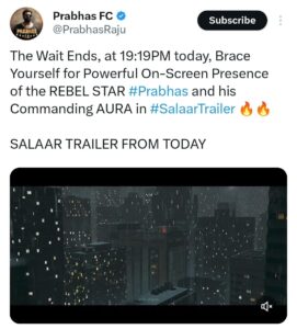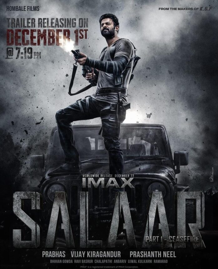 साउथ अभिनेता प्रभास स्टारर फिल्म ‘सालार पार्ट 1: सीजफायर’ साल 2023 की मोस्ट अवेटेड फिल्मों में से एक है। इस फिल्म की रिलीज का फैंस बेसब्री से इंतजार कर रहे हैं। वहीं अब फाइनली ‘सालार पार्ट 1: सीजफायर’ का इंतजार खत्म होने के करीब आ रहा है। दरअसल फिल्म बड़े पर्दे पर आने से बस कुछ ही हफ्ते दूर है। जुलाई में रिलीज हुए फिल्म के टीजर से लोग काफी इंप्रेस हुए थे और अब फ़िल्म के ट्रेलर को लेकर भी हर कोई एक्साइटेड हैं। मीडिया सूत्रों से मिली जानकारी के अनुसार, दरअसल फिल्म का ट्रेलर आज 1 दिसंबर को शाम 7 बजकर 19 मिनट रिलीज किया जाएगा। प्रभास ने सोशल मीडिया पर फिल्म का पोस्टर शेयर कर ट्रेलर रिलीज की डेट और टाइमिंग की अनाउंसमेंट की है।