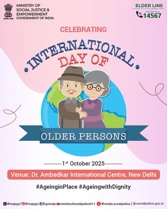 मीडिया सूत्रों से मिली जानकारी के अनुसार, सामाजिक न्याय एवं अधिकारिता मंत्रालय आज नई दिल्ली में अंतर्राष्ट्रीय वरिष्ठ नागरिक दिवस मनाएगा। मंत्रालय ने एक बयान में कहा कि यह कार्यक्रम वरिष्ठ नागरिकों के लिए एक सम्मानजनक और सक्षम पारिस्थितिकी तंत्र बनाने की सरकार की प्रतिबद्धता को जताता है।