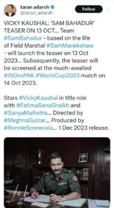‘सैम बहादुर’ के टीजर की रिलीज डेट का हुआ ऐलान