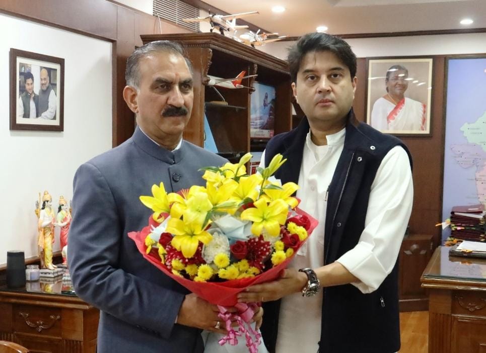 हिमाचल प्रदेश के मुख्यमंत्री सुखविंदर सिंह सुक्खू ने शुक्रवार को नई दिल्ली में केंद्रीय नागर विमानन मंत्री ज्योतिरादित्य सिंधिया से शिष्टाचार भेंट की।