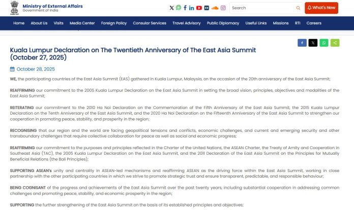 20वें पूर्व एशिया सम्‍मेलन में शांति और स्थिरता के संकल्‍प के साथ कुआलालंपुर घोषणा का अनुमोदन