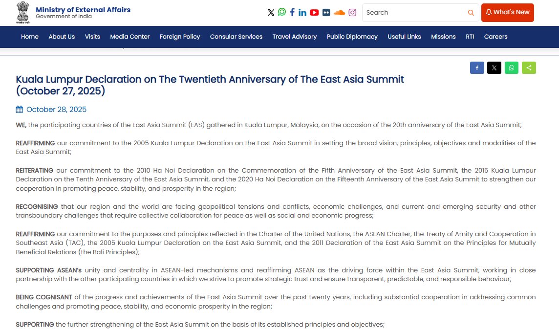 मीडिया सूत्रों से मिली जानकारी के अनुसार, बीसवें पूर्व एशिया सम्‍मेलन में शांति और स्थिरता के संकल्‍प के साथ कुआलालंपुर घोषणा का अनुमोदन कर लिया गया है। इसमें रणनीतिक विश्‍वास को बढ़ावा देने और क्षेत्रीय तथा अंतर्राष्‍ट्रीय मामलों में पारदर्शिता तथा जिम्‍मेदारी पूर्ण व्‍यवहार सुनिश्चित करने के लिए अन्‍य सहभागी देशों के साथ साझेदारी बढ़ाने का आह्वान किया गया है। इस घोषणा पत्र में क्षेत्रीय विकास सहयोग, सुरक्षा नीतियों, आपदा प्रबंधन के बारे में जानकारी साझा करने के महत्‍व और बदलती क्षेत्रीय संरचनाओं पर चर्चा पर बल दिया गया है।
