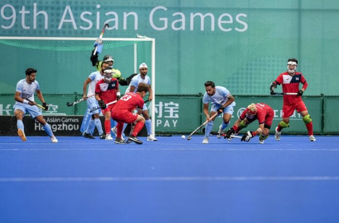 मीडिया सूत्रों से प्राप्त जानकारी के अनुसार, एशियाई खेलों में पुरुष हॉकी के सेमीफाइनल में भारत ने दक्षिण कोरिया को 5-3 से हरा दिया है। इसके साथ ही भारत ने फाइनल में जगह बना ली है। भारतीय पुरुष हॉकी टीम शुक्रवार को स्वर्ण पदक मैच में चीन और जापान के बीच दूसरे सेमीफाइनल मैच के विजेता से भिड़ेगी।