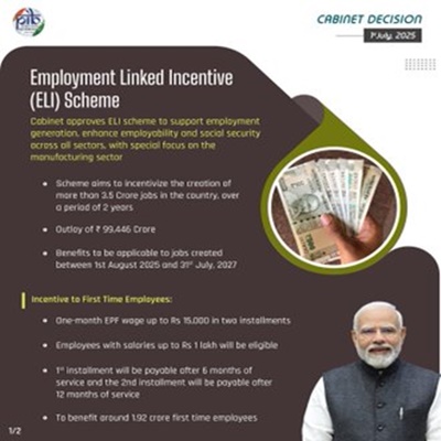 According to media sources, The Union Cabinet has approved the employment-linked incentive scheme to generate employment and provide social security across all sectors, with special focus on the manufacturing sector. Briefing media about the Cabinet decisions in New Delhi today, Information and Broadcasting Minister Ashwini Vaishnaw said, first-time employees will get one month’s wage up to 15 thousand rupees under the scheme. He said the employers will be given incentives for a period of up to two years for generating additional employment, with extended benefits for another two years for the manufacturing sector.