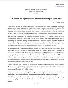 CBI ( Information Section) informed that, CBI has Arrested Two Agents Involved in the illegal trafficking of Indian nationals to Cyber Crime Scam Compounds located in Myanmar.