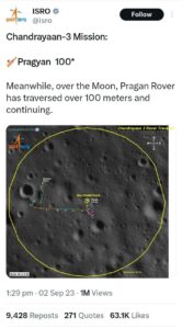 भारतीय अंतरिक्ष अनुसंधान संगठन (ISRO) का मिशन चंद्रयान-3 चंद्रमा से लगातार नई-नई जानकारियां भेज रहा है। इस बीच ISRO ने एक और बड़ी जानकारी साझा करते हुए बताया कि चंद्रयान-3 के रोवर प्रज्ञान ने चंद्रमा की सतह पर 100 मीटर से ज्यादा की दूरी तय कर ली है। मीडिया की माने तो, ISRO ने X पर (ट्वीट) किया, “प्रज्ञान 100*…इस बीच, चंद्रमा के ऊपर, प्रागन रोवर 100 मीटर से अधिक की दूरी तय कर चुका है और जारी है।”