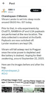 भारत के चंद्रयान-3 मिशन का विक्रम लैंडर स्लीप मोड में चला गया है। ISRO ने सोमवार को ये जानकारी दी। स्पेस एजेंसी ने साथ ही बताया कि इसकी अब 22 सितंबर के आसपास एक्टिव होने की उम्मीद है। मीडिया सूत्रों से मिली जानकारी के अनुसार, ISRO ने सोशल मीडिया प्लेटफॉर्म X पर पोस्ट कर बताया, विक्रम लैंडर लगभग 08:00 बजे स्लीप मोड में सेट हो गया। IST आज। इससे पहले, चाएसटीई, रंभा-एलपी और आईएलएसए पेलोड द्वारा इन-सीटू प्रयोग नए स्थान पर किए जाते हैं। एकत्र किया गया डेटा पृथ्वी पर प्राप्त होता है। पेलोड अब बंद कर दिए गए हैं। लैंडर रिसीवर चालू रखे गए हैं। सौर ऊर्जा ख़त्म हो जाने और बैटरी खत्म हो जाने पर विक्रम, प्रज्ञान के बगल में सो जाएगा। 22 सितंबर, 2023 के आसपास उनके जागृत होने की उम्मीद है।