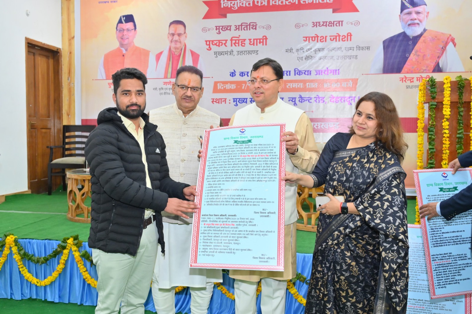 जानकारी के मुताबिक, उत्तराखंड में नौकरियां पाने वाले यह युवा ग्राम विकास अधिकारी (वीडीओ) पद के लिए चयनित हुए है। इस मौके पर मुख्यमंत्री ने सभी उम्मीदवारों को नियुक्ति पत्र वितरित किए। उत्तराखंड के मुख्यमंत्री पुष्कर सिंह धामी ने इस कार्यक्रम को संबोधित करते हुए कहा कि, प्रधानमंत्री मोदी के विकसित भारत के सपने के संकल्प को लेकर अपनी बात कही। उन्होंने इस मौके पर कहा कि, नियुक्ति पत्र पाने वाले सभी अभ्यर्थियों के उज्ज्वल भविष्य की कामना करता हूं और मुझे पूर्ण विश्वास है कि आप सभी प्रतिबद्धता के साथ अपने कर्तव्यों का निर्वहन करते हुए जनसेवा करेंगे। हमारी सरकार तेज गति से विभागों में रिक्त पदों को भरने का कार्य कर रही है। युवाओं के उज्ज्वल भविष्य के लिए हम ऐतिहासिक सख़्त नकल विरोधी कानून लेकर आए जिसका परिणाम है कि आज सभी प्रतियोगी परीक्षाएं पूर्ण पारदर्शिता के साथ संपन्न हो रही हैं।