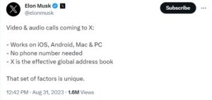 माइक्रोब्लॉगिंग प्लेटफॉर्म X, जो पहले Twitter के तौर पर पहचाना जाता था, उसमे बड़े बदलाव का दौर जारी है। Elon Musk यूजर्स के एक्सपीरियंस को बेहतर बनाने के लिए धीरे-धीरे नए-नए फीचर्स को X में जोड़ते जा रहे हैं। मीडिया सूत्रों से प्राप्त जानकारी के अनुसार, Elon Musk द्वारा शेयर किए हालिया पोस्ट के मुताबिक कंपनी अब X (ट्विटर) पर बहुत बड़ा बदलाव करने जा रही है। एलन मस्क ने X पर पोस्ट कर बताया कि X पर वीडियो और ऑडियो कॉल सर्विस आने वाली है। इस फीचर्स की सबसे खासबात ये है कि आपको एक-दूजे को वीडियो कॉलिंग के लिए फोन नंबर की जरूरत नहीं होगी। मीडिया सूत्रों के अनुसार, ये सुविधा X के iOS, Android, MAC और PC सभी यूजर्स को मिलेगी। एलन मस्क ने X पर पोस्ट कर बताया कि एक्स पर वीडियो और ऑडियो कॉल सर्विस आने वाली है। मस्क ने कहा कि X एक इफेक्टिव ग्लोबल एड्रेस बुक है।