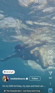 बताते चले कि, आज 29 दिसंबर को ट्विंकल खन्ना ने अपने इंस्टाग्राम पर अपने जन्मदिन पर एक वीडियो पोस्ट किया। वीडियो में उनके पति अक्षय कुमार और बच्चों-आरव और नितारा के साथ उनकी तैराकी, स्नॉर्कलिंग की झलक दिखाई गई है। वीडियो शेयर करते हुए उन्होंने कैप्शन में लिखा कि लोग ‘महान दार्शनिकों का हवाला दे सकते हैं’ लेकिन वह ‘बस तैरते रहो’ में विश्वास करती हैं, उन्होंने लिखा, “मेरे 50वें जन्मदिन पर, जब मैं देखती हूं तो मेरी आंखें और दिल अभी भी हैरानी से भर जाते हैं।” मेरे और मेरे परिवार के आसपास की दुनिया। लोग महान दार्शनिकों का हवाला दे सकते हैं, लेकिन मैं फाइंडिंग निमो की डोरी को फॉलो करती हूं, जहां, चाहे जीवन कुछ भी लाए, वह कहती है, ‘बस तैरते रहो।’ रोमांच कभी खत्म न हो।”