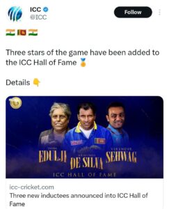 मीडिया की माने तो, ICC ने सोशल मीडिया पोस्ट कर इस बात की जानकारी दी। वीरेन्द्र सहवाग के अलावा डायना इडुलजी और श्रीलंका के पूर्व दिग्गज खिलाड़ी अरविंदा डी सिल्वा को आईसीसी हॉल ऑफ फेम में जगह मिली है। आईसीसी के हॉल ऑफ फेम में वीरेंद्र सहवाग, डायना एडुल्जी और अरविंदा डी सिल्वा शामिल होने वाले लेटेस्ट खिलाड़ी हैं, जैसा कि अंतर्राष्ट्रीय क्रिकेट परिषद ने 13 नवंबर(सोमवार) को ICC ने सोशल मीडिया पर यह घोषणा की। सहवाग, एडुल्जी और डी सिल्वा अपने-अपने तरीके से क्रिकेट के खेल के महान खिलाड़ी रहे हैं। सहवाग ने 2007 टी20 विश्व कप और 2011 विश्व कप जीता और भारत को दोनों ट्रॉफी जिताने में महत्वपूर्ण भूमिका निभाई। डी सिल्वा श्रीलंका की 1996 विश्व कप विजेता टीम का हिस्सा थे और एडुल्जी ने पहले एक खिलाड़ी के रूप में और बाद में एक प्रशासक के रूप में महिला क्रिकेट पर व्यापक प्रभाव डाला है। वह ICC हॉल ऑफ फेम में शामिल होने वाली पहली भारतीय महिला क्रिकेटर हैं।